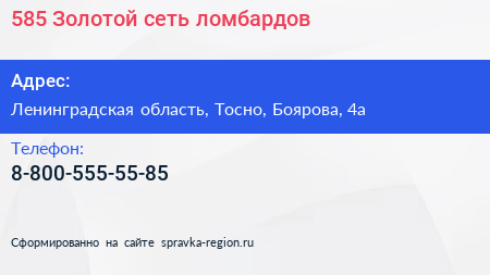 585*Золотой, сеть ломбардов по адресу Ленинградская область, Тосно, Боярова, 4а в дальнейшем Организация, размещена в следующих категориях:
