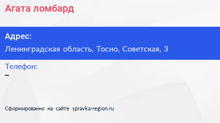 Агата, ломбард по адресу Ленинградская область, Тосно, Советская, 3 в дальнейшем Организация, размещена в следующих категориях: