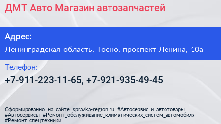 ДМТ-Авто, Магазин автозапчастей по адресу Ленинградская область, Тосно, проспект Ленина, 10а в дальнейшем Организация, размещена в следующих категориях:
