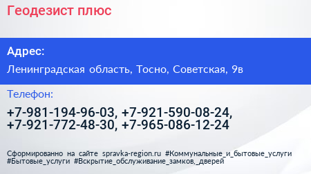 Геодезист плюс по адресу Ленинградская область, Тосно, Советская, 9в в дальнейшем Организация, размещена в следующих категориях: