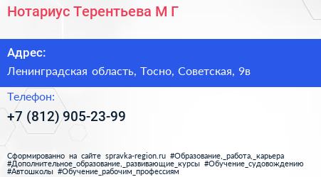 Нотариус Терентьева М.Г. по адресу Ленинградская область, Тосно, Советская, 9в в дальнейшем Организация, размещена в следующих категориях: