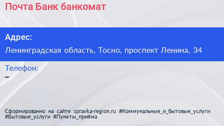 Почта Банк, банкомат по адресу Ленинградская область, Тосно, проспект Ленина, 34 в дальнейшем Организация, размещена в следующих категориях: