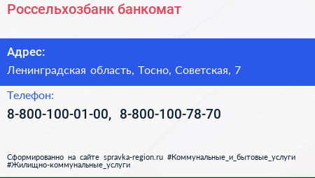 Россельхозбанк, банкомат по адресу Ленинградская область, Тосно, Советская, 7 в дальнейшем Организация, размещена в следующих категориях: