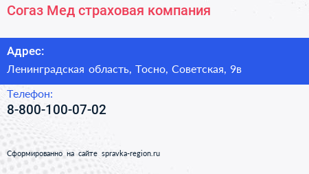 Согаз-Мед, страховая компания по адресу Ленинградская область, Тосно, Советская, 9в в дальнейшем Организация, размещена в следующих категориях:
