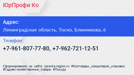 ЮрПрофи Ко по адресу Ленинградская область, Тосно, Блинникова, 6 в дальнейшем Организация, размещена в следующих категориях: