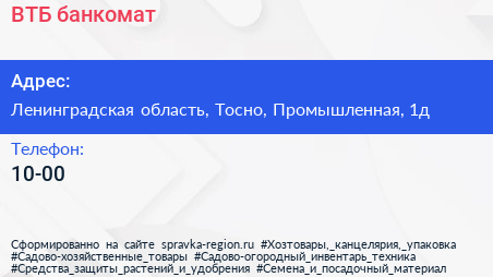ВТБ, банкомат по адресу Ленинградская область, Тосно, Промышленная, 1д в дальнейшем Организация, размещена в следующих категориях: