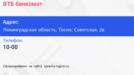 ВТБ, банкомат по адресу Ленинградская область, Тосно, Советская, 2в в дальнейшем Организация, размещена в следующих категориях: