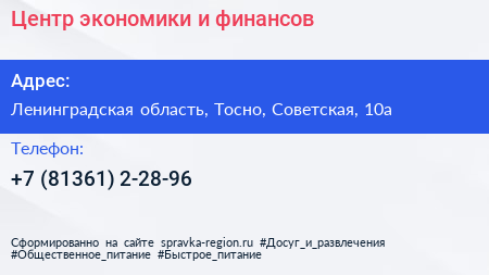 Центр экономики и финансов по адресу Ленинградская область, Тосно, Советская, 10а в дальнейшем Организация, размещена в следующих категориях: