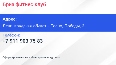 Бриз, фитнес-клуб по адресу Ленинградская область, Тосно, Победы, 2 в дальнейшем Организация, размещена в следующих категориях: