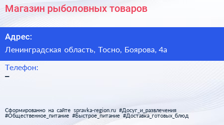 Магазин рыболовных товаров по адресу Ленинградская область, Тосно, Боярова, 4а в дальнейшем Организация, размещена в следующих категориях: