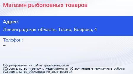 Магазин рыболовных товаров по адресу Ленинградская область, Тосно, Боярова, 4 в дальнейшем Организация, размещена в следующих категориях: