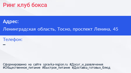 Ринг, клуб бокса по адресу Ленинградская область, Тосно, проспект Ленина, 45 в дальнейшем Организация, размещена в следующих категориях: