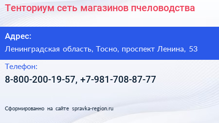 Тенториум, сеть магазинов пчеловодства по адресу Ленинградская область, Тосно, проспект Ленина, 53 в дальнейшем Организация, размещена в следующих категориях: