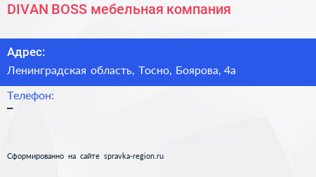 DIVAN BOSS, мебельная компания по адресу Ленинградская область, Тосно, Боярова, 4а в дальнейшем Организация, размещена в следующих категориях: