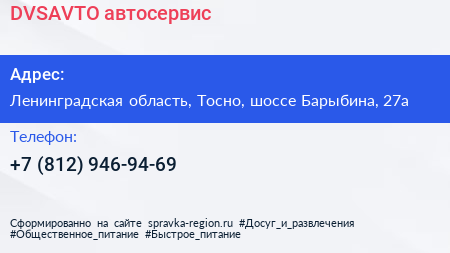 DVSAVTO, автосервис по адресу Ленинградская область, Тосно, шоссе Барыбина, 27а в дальнейшем Организация, размещена в следующих категориях: