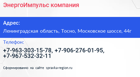 ЭнергоИмпульс, компания по адресу Ленинградская область, Тосно, Московское шоссе, 44г в дальнейшем Организация, размещена в следующих категориях: