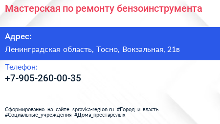 Мастерская по ремонту бензоинструмента по адресу Ленинградская область, Тосно, Вокзальная, 21в в дальнейшем Организация, размещена в следующих категориях: