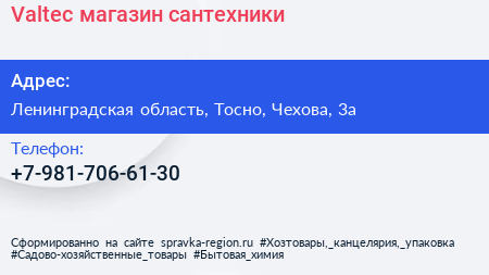 Valtec, магазин сантехники по адресу Ленинградская область, Тосно, Чехова, 3а в дальнейшем Организация, размещена в следующих категориях: