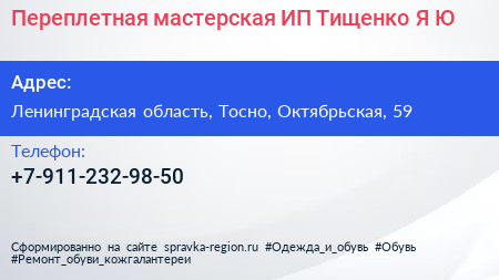 Переплетная мастерская, ИП Тищенко Я.Ю. по адресу Ленинградская область, Тосно, Октябрьская, 59 в дальнейшем Организация, размещена в следующих категориях: