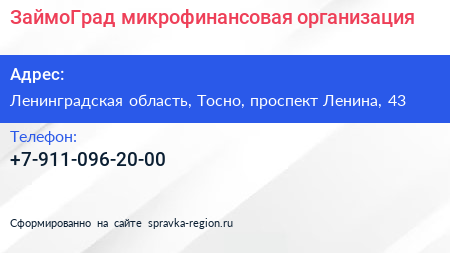 ЗаймоГрад, микрофинансовая организация по адресу Ленинградская область, Тосно, проспект Ленина, 43 в дальнейшем Организация, размещена в следующих категориях: