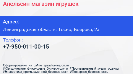 Апельсин, магазин игрушек по адресу Ленинградская область, Тосно, Боярова, 2а в дальнейшем Организация, размещена в следующих категориях: