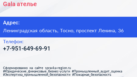 Gala, ателье по адресу Ленинградская область, Тосно, проспект Ленина, 36 в дальнейшем Организация, размещена в следующих категориях: