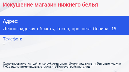 Искушение, магазин нижнего белья по адресу Ленинградская область, Тосно, проспект Ленина, 19 в дальнейшем Организация, размещена в следующих категориях: