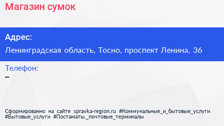 Магазин сумок по адресу Ленинградская область, Тосно, проспект Ленина, 36 в дальнейшем Организация, размещена в следующих категориях: