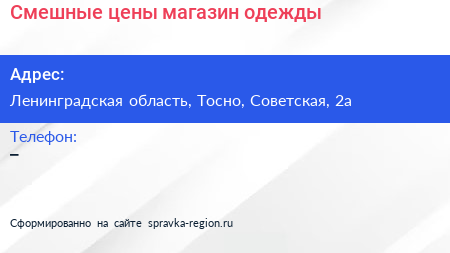 Смешные цены, магазин одежды по адресу Ленинградская область, Тосно, Советская, 2а в дальнейшем Организация, размещена в следующих категориях: