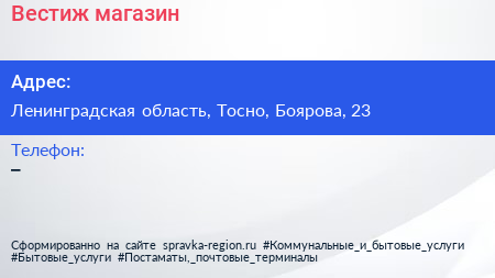Вестиж, магазин по адресу Ленинградская область, Тосно, Боярова, 23 в дальнейшем Организация, размещена в следующих категориях: