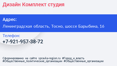Дизайн-Комплект, студия по адресу Ленинградская область, Тосно, шоссе Барыбина, 16 в дальнейшем Организация, размещена в следующих категориях: