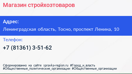 Магазин стройхозтоваров по адресу Ленинградская область, Тосно, проспект Ленина, 10 в дальнейшем Организация, размещена в следующих категориях: