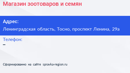 Магазин зоотоваров и семян по адресу Ленинградская область, Тосно, проспект Ленина, 29а в дальнейшем Организация, размещена в следующих категориях: