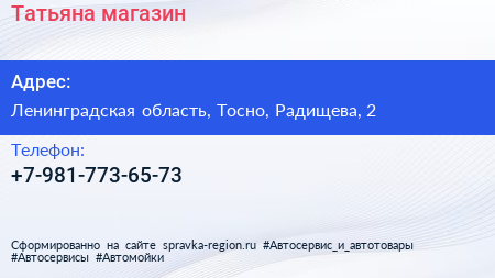 Татьяна, магазин по адресу Ленинградская область, Тосно, Радищева, 2 в дальнейшем Организация, размещена в следующих категориях: