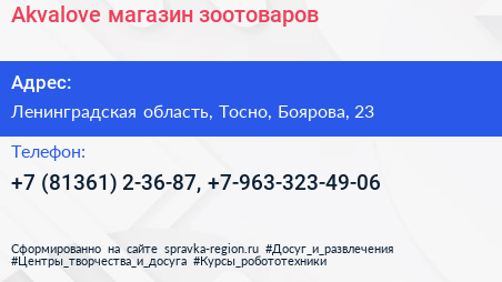Akvalove, магазин зоотоваров по адресу Ленинградская область, Тосно, Боярова, 23 в дальнейшем Организация, размещена в следующих категориях: