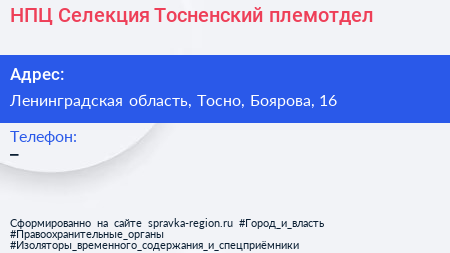 НПЦ Селекция, Тосненский племотдел по адресу Ленинградская область, Тосно, Боярова, 16 в дальнейшем Организация, размещена в следующих категориях:
