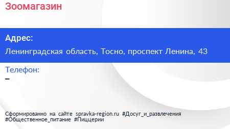 Зоомагазин по адресу Ленинградская область, Тосно, проспект Ленина, 43 в дальнейшем Организация, размещена в следующих категориях: