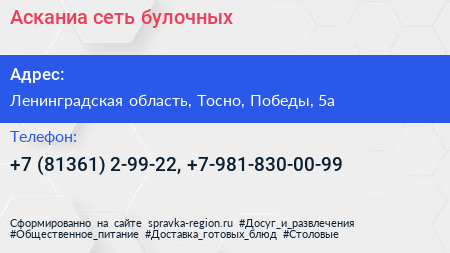 Асканиа, сеть булочных по адресу Ленинградская область, Тосно, Победы, 5а в дальнейшем Организация, размещена в следующих категориях: