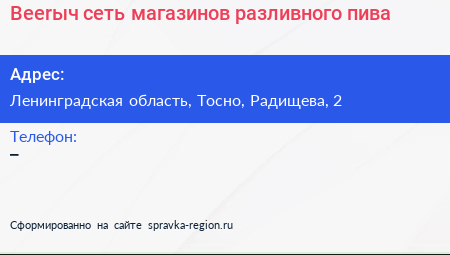 Beerыч, сеть магазинов разливного пива по адресу Ленинградская область, Тосно, Радищева, 2 в дальнейшем Организация, размещена в следующих категориях: