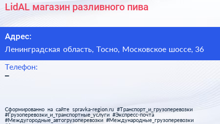 LidAL, магазин разливного пива по адресу Ленинградская область, Тосно, Московское шоссе, 36 в дальнейшем Организация, размещена в следующих категориях: