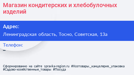 Магазин кондитерских и хлебобулочных изделий по адресу Ленинградская область, Тосно, Советская, 13а в дальнейшем Организация, размещена в следующих категориях: