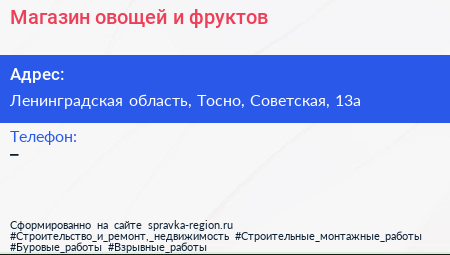 Магазин овощей и фруктов по адресу Ленинградская область, Тосно, Советская, 13а в дальнейшем Организация, размещена в следующих категориях: