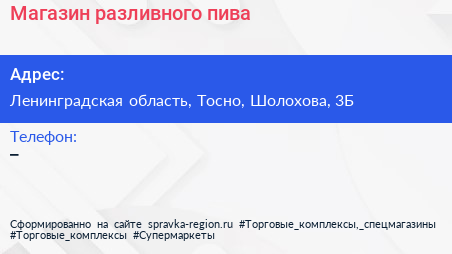 Магазин разливного пива по адресу Ленинградская область, Тосно, Шолохова, 3Б в дальнейшем Организация, размещена в следующих категориях: