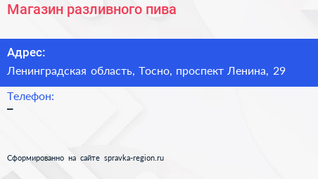 Магазин разливного пива по адресу Ленинградская область, Тосно, проспект Ленина, 29 в дальнейшем Организация, размещена в следующих категориях: