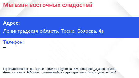 Магазин восточных сладостей по адресу Ленинградская область, Тосно, Боярова, 4а в дальнейшем Организация, размещена в следующих категориях: