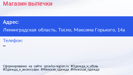 Магазин выпечки по адресу Ленинградская область, Тосно, Максима Горького, 14а в дальнейшем Организация, размещена в следующих категориях: