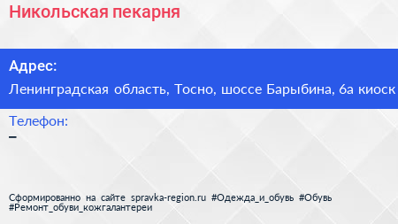 Никольская пекарня по адресу Ленинградская область, Тосно, шоссе Барыбина, 6а киоск в дальнейшем Организация, размещена в следующих категориях: