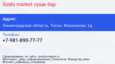 Sushi market, суши-бар по адресу Ленинградская область, Тосно, Вокзальная, 1д в дальнейшем Организация, размещена в следующих категориях: