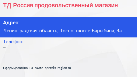 ТД Россия, продовольственный магазин по адресу Ленинградская область, Тосно, шоссе Барыбина, 4а в дальнейшем Организация, размещена в следующих категориях: