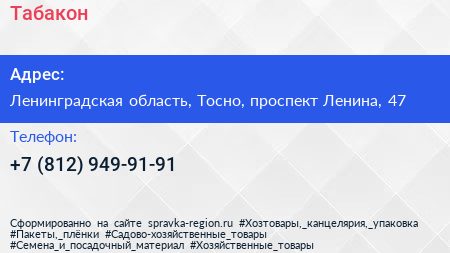 Табакон по адресу Ленинградская область, Тосно, проспект Ленина, 47 в дальнейшем Организация, размещена в следующих категориях: